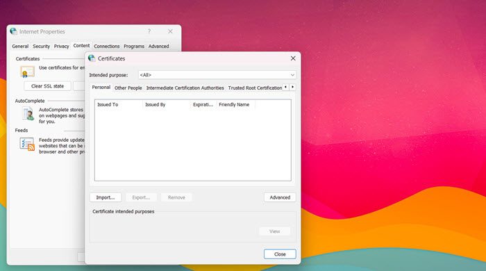 - Auf der Registerkarte „Persönlich“ sollte Ihr Codesignaturzertifikat angezeigt werden. Wenn es fehlt, laden Sie das Zertifikat mit der von Ihrer Zertifizierungsstelle (CA) bereitgestellten Software vom Token in Windows. Erst nach diesem Schritt kann Excel das Zertifikat sehen.